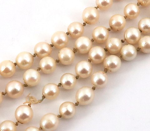 Perlekæde med perleprydet lås af sølv, monteret med 6 mm. kulturperler. Kæden er ikke påsat ved den ene side af låsen og er i øvrigt i to dele. Oprindelig længde 48 cm.