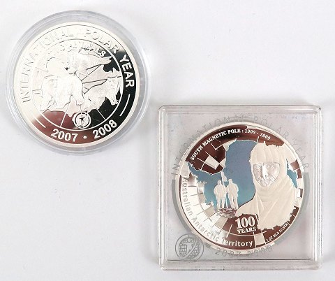 Australien, AU Dollar one ounce finsølv 2009 *Den Magnetiske Sydpol* samt Nordkorea, 1000 Won finsølv *International Polarår 2007-2008. Begge mønter i proof kvalitete. Leveres i plexiglas kapsler.