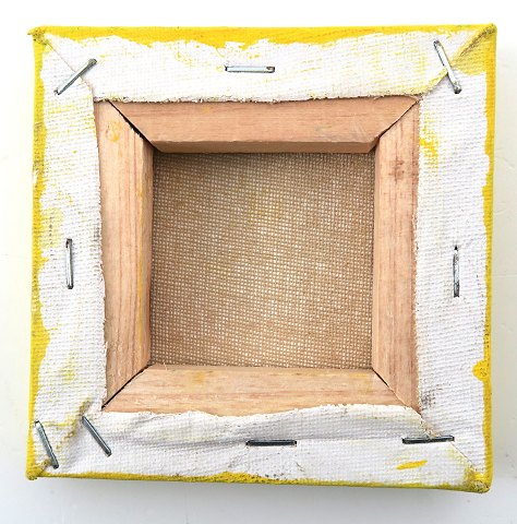 3 stk. Buillon dollar sølv, klæbt med let løselig, vandbaseret lim på citrongult bemalet malerlærred 10 x 10 cm. Samlet finsølvindhold 93,3 gr.