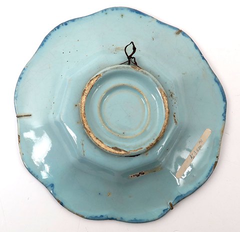 Antik fajance skål af os ukendt herkomst. Skål med buet, svag skævknækket rand, underglasur dekoreret med figurer og landskab. Diameter 22,5 cm. Tilskrevet 1700 årene.