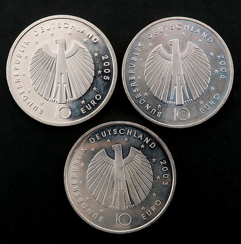 3x 10 € sterling sølv 2006 *FIFA Fussball Weltmeisterschaft Deutschland 2006*, revers hver mønt med et forskelligt motiv, samlet vægt 54 gr. Henholdsvis KM 223, KM 243 og KM 249