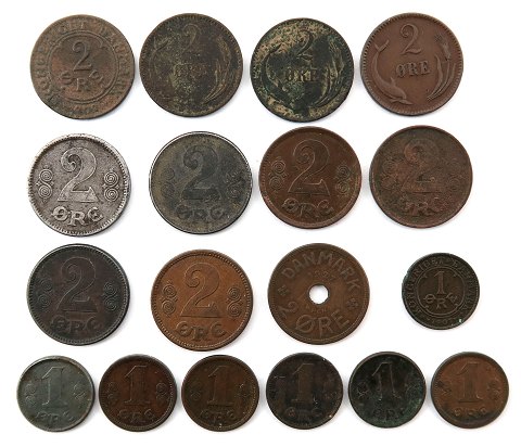 Lot bestående af Frederik VIII, 1 øre 1907, Christian X, 1 øre 1919 jern VBP - H 19A, samt 1 øre 2x 1913, -15, 2x 1923 endvidere Frederik VIII, 2 øre med utydelig årstal, Christian IX, 2 øre 2x 1899 samt 1902, Christian X, 2x 2 øre jern 1918 - H 17A samt 2 øre 1917, -18, -20, -23 og 1927 med hul.