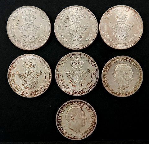 2x 3 kr. sølv *Prinsesse Margrethes 18 års fødselsdag 1958* - H 3 samt 5x 5 kr. sølv *Frederik IX og Dronning Ingrids sølvbryllup 1960* - H1