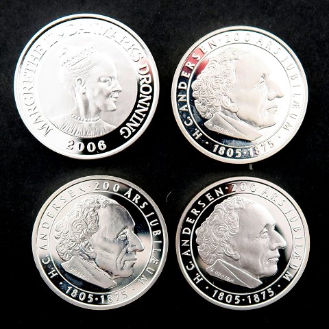 10 kr. sølv 2005, udgivet i anledning af digterens 250 års dag 1805-2005 samt 3 H.C Andersen eventyr medailler af sølv *Svinedrengen*, *Kejserens nye klæder* og *Hyrdinden og skorstensfejeren*, samlet vægt 80,7 gr. Leveres i plexiglaskapsler.