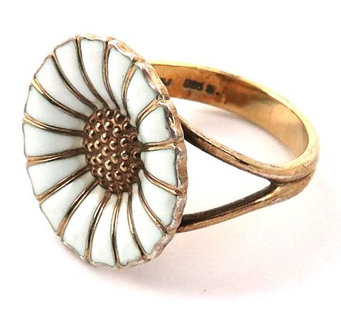 GJ ring af forgyldt sterling sølv med forhøjet front i form af emaillebelagt marguerit. Ring str. 50