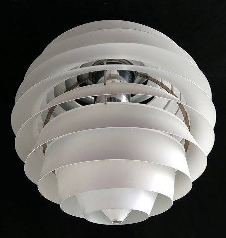 PH - Louvre loftslampe, diameter 60 cm., H. 65 cm. Indvendig med konisk fatningsskjuler, baldakin og ophæng med aflastningswire. Lampen er tegnet i 1957 til Adventistkirken i Skodsborg. Kugleformet korpus med 13 hvidlakeret aluminiumslameller.
