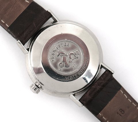 Omega Seamaster Automatic vintage herrearmbåndsur, ref. nr. 17947463 i urkasse af stål. Metalgrå skive med Omega logo i relief, stregindikation og central sekundviser. Automatisk værk kaliber 591. Urkasse diameter 34 mm. Læderrem med Omega spænde.