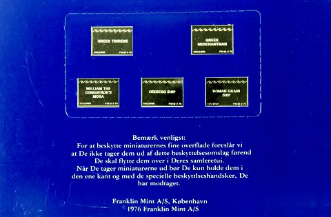 5 sølvbarrer af sterling sølv, præget med motiver af historiens store sejlskibe, monteret i forseglet kort. Samlet vægt ca. 25 gr.