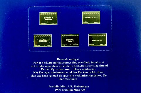 5 sølvbarrer af sterling sølv, præget med motiver af historiens store sejlskibe, monteret i forseglet kort. Samlet vægt ca. 25 gr.