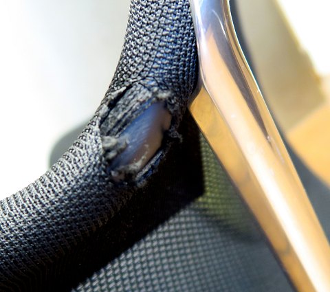 Stoffet er revnet ved venstre armlæn.