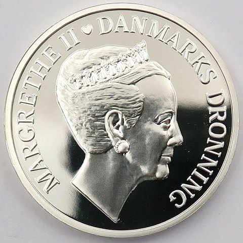 Præget i anledning af HM Dronning Margrethes 70 års fødselsdag den 16. april 2010. Avers Dronningens portræt udformet af billedhuggeren Lis Nogel - Revers designet af kgl. våbenmaler Ronny Andersen.
