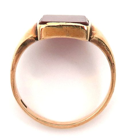 Herrering af 14 kt. guld med ligesidet, mørkerød sten 10 x 14 mm. Ring Str. 61, samlet vægt ca. 5 gr.