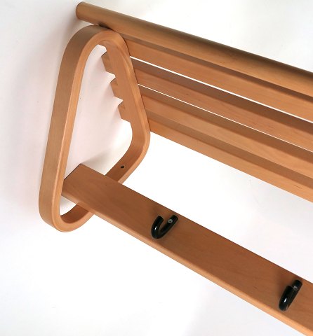 Alvar Aalto hattehylde af formbøjet birketræ, monteret med 4 knager af sortlakeret metal. B. 100 cm.