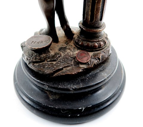Noée bronzefigur i form af Gratie, stående ved søjle. H. inkl. fodstykke af fedtsten 32 cm. Manufaktur: European Bronze Finery.