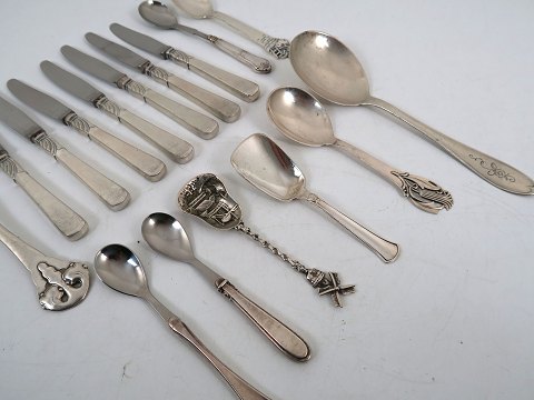 Lot bestående af 7 frokostknive, kartoffelske, 7 mindre serveringskeer samt en enkelt gaffel. Enkelte frokostknive med løs eller repareret klinge. Vægt på sølvdelene ca. 240 gr.