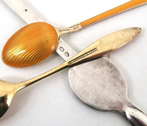 Lot bestående af 14 forskellige, emailledekorerede moccaskeer af forgyldt sterling sølv samt 6 hummergafler af sølvplet. moccaskeers vægt ca. 132 gr.