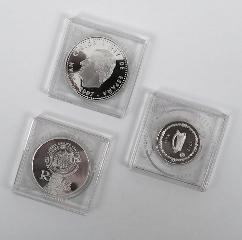 Polarmønter 2007 af sterlingsølv. Spanien 10 Euro 27 gr. sterling sølv, Frankrig 1 ½ Euro 22 gr. sterling sølv, og Irland 5 Euro 8,54 gr. sterling sølv.