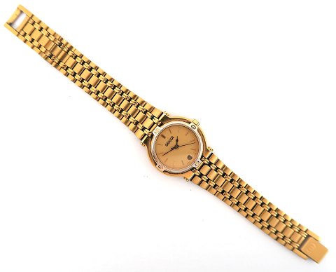 Gucci damearmbåndsur, ref. nr. 9200 L i urkasse af gulddoublé og med lænke af stål. Champagnefarvet skive med stregindikation, central sekundviser og datovisning i #6 position. Quartzværk. Urkasse diameter 24 mm.