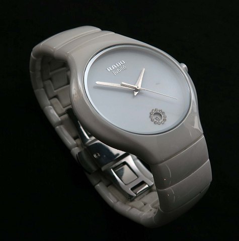 Rado Jubilé Unisex high tech armbåndsur i hvid, keramisk urkasse og med keramisk lænke. Hvid skive bag safirglas uden indikation , central sekundviser og stenomkranset datovisning i#6 position. Quartzværk. Urkasse diameter 40 mm.