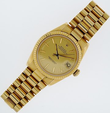 Midsizearmbåndsur fra Rolex, model Datejust, ref.nr.: 6827, i kasse og m. presidentlænke i 18 kt. guld, champagnefarvet skive m. stregindeks, datoangivelse ved 3" position, safirglas, automatisk urværk. Ø. 29 mm.