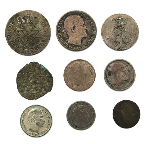 Lot bestående af Frederik III, 2 Skilling 1663 (?), Frederik IV, 12 Skilling 1717, Frederik V, 1 Skilling 1763, Christian VII, 4 Skilling 1807, Christian VIII, 3 Rigsbankskilling 1842 og 4 Rigsbankskilling 1841, Frederik VII, 16 Skilling RM 1856 og 4 Skilling RM 1854 samt Christian IX, 4 Skilling RM 1870.