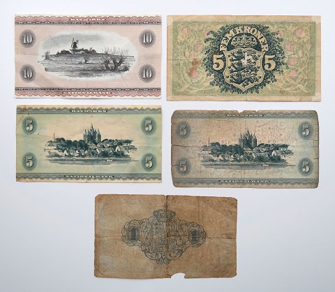 Lot bestående af 1 kr. 1921 U, 5 kr. 1942 J, 5 kr. 1950 A5 0J erstatningsseddel, 5 kr. 1958 B8, 10 kr. C3 0J erstatningsseddel.