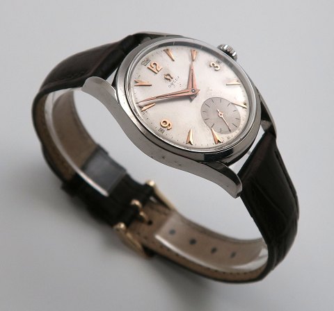 Omega, klassisk herrearmbåndsur, ref nr. 2667 9SC i urkasse af stål. Metalgrå skive bag plexiglas med arabertal- og stregindikation samt separat sekundviser. Manuel mekanisk optræksværk kaliber 410. Urkasse diameter 32 mm. Fornyet læderrem med metalspænde.