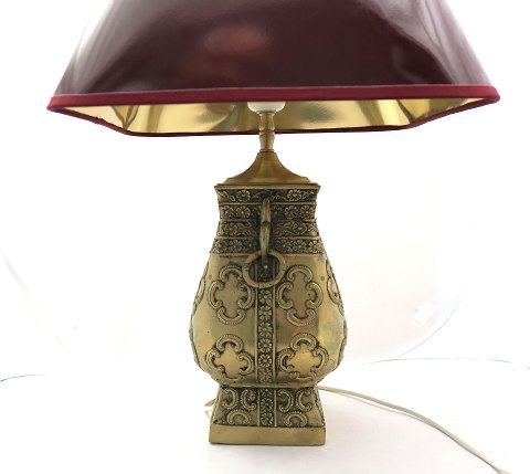 Par kinesiske konsollamper med støbt korpus af messing, dekoreret med blomsterbånd og volutter, ligesidede skærme af laqueur typen. H. til skærmtop 53 cm. 20. årh.