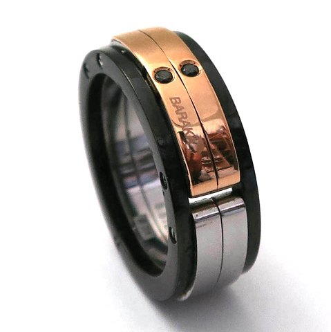 Baraka herrering af 18 kt. rosefarvet guld og stål og high tech keramik, prydet med 2 med sorte diamanter på tilsammen 0,02 ct. Ring Str. 63. Originalt Bakara opbevaringsetui og købsbevis medfølger.