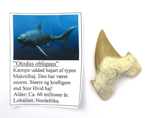 Forstenet tand fra *Otodus obliquus* haj, ca. 60 mio. år gammel. L. med rod henholdsvis 64 mm.