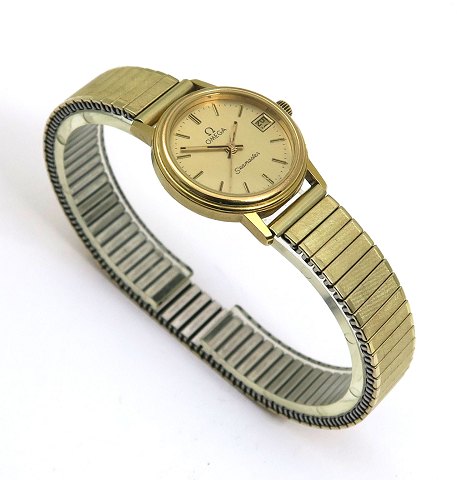 Omega Seamaster Quartz damearmbåndsur i urkasse af gulddoublé. Champagnefarvet skive med stregindikation, central sekundviser og datovisning i #3 position. Quartzværk. Urkasse diameter 22 mm. Fixo-flex lænke.