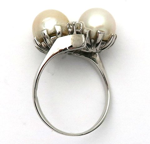 Ring af 14 kt. guld med cross-over skinne, prydet med 2 brillantslebne diamanter på tilsammen ca. 0,12 ct. samt to 7½ mm. kulturperler. Ring Str. 52, samlet vægt ca. 4 gr.