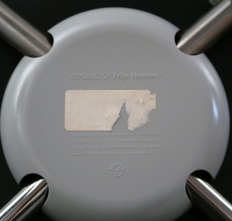 Arne Jacobsen 7'er stole model AJ 3207, skal af formbøjet krydsfinér, forsidepolstret med sort stof, armlæn betrukket med sort læder, stel af forkromede stålrør. Sæde H. ca. 45 cm. Ryg H. 78 cm. Fremstillet hos Fritz Hansen.