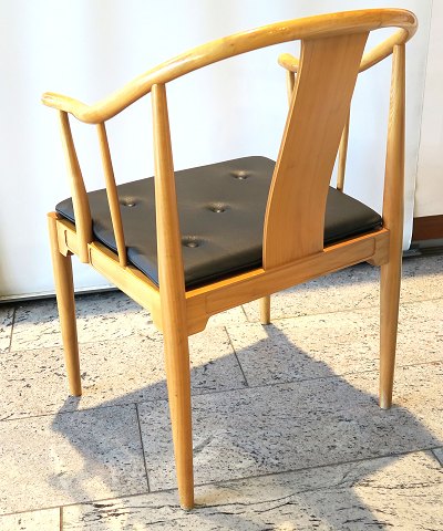 Hans J. Wegner, Kinastol FH4283 af lakeret kirsebær med ny, løs hynde betrukket med sort kærnelæder. Formgivet i 1944. Produceret hos Fritz Hansen.