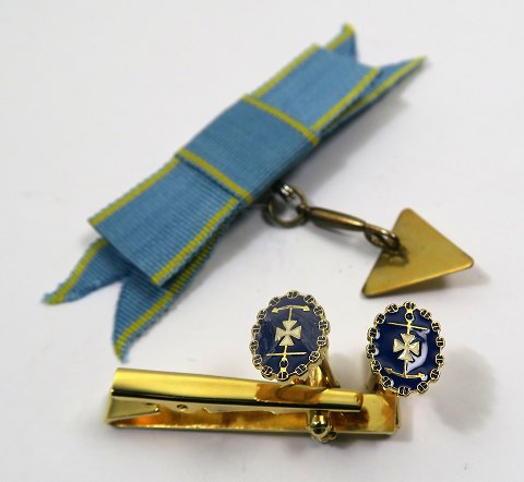 Lot frimurereffekter, bestående af slipsenål, par manchetknapper og murerske med ordensbånd. Æske med påtryk *Frimureriet i Danmark i 250 år - 1743-1993 medfølger.