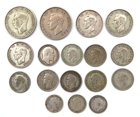 Engelske shilling- og pencemønter, 3x 3 pence, 9x 6 pence, 3x 1 shilling og 2x 2 shillings