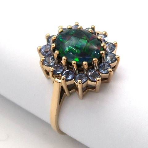 Ring af 10 kt. guld med opal, omkranset af tanzanitter