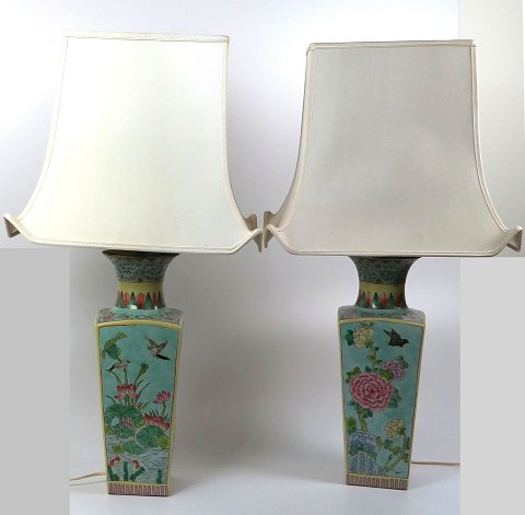 Par kinesiske bordlamper af porcelæn, håndbemalet med fugle- og blomstermotiver samt kinesisk ornamentik. Oprindelsesoplysninger er påtegnet med kinesiske skrifttegn i bunden. Lamperne er monteret til elektrisk lys og begge er med skærm. H. med skærm 80 cm. 20 årh.