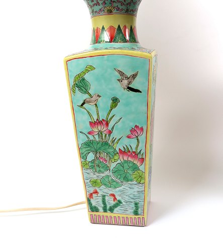 Par kinesiske bordlamper af porcelæn, håndbemalet med fugle- og blomstermotiver samt kinesisk ornamentik. Oprindelsesoplysninger er påtegnet med kinesiske skrifttegn i bunden. Lamperne er monteret til elektrisk lys og begge er med skærm. H. med skærm 80 cm. 20 årh.