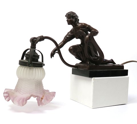 Skønvirke klaverlampe af bronze, korpus i form af pige med lyra, knælende over to nodehæfter på marmorsokkel. Blomstformet, lillatonet lampeglas, E-27 fatning af porcelæn. Figur med sokkel H. 19 cm. Indvendig monteret med den originale stofledning,