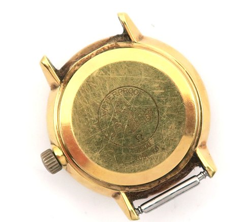 Omega damearmbåndsur i urkasse af formodentlig kun forgyldt metal. Metallic skive med stregindikation. Manuelt mekanisk optræksværk. Urkasse diameter 22 mm., vægt ca. 10 gr.