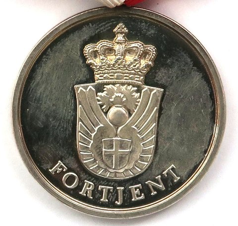 Revers kronet våbenskjold og skriften *Fortjent*. Diameter 30 mm.