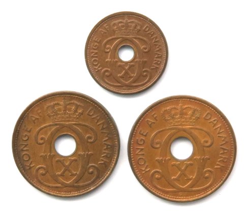 Christian X, 1 øre 1929 samt 2 øre 1938 og 1940
