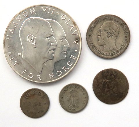 Christian VII, 2 Skilling 18??, Oskar II. 10 øre/3 Skilling sølv 1874, 50 øre sølv 1889 og 10 øre sølv 1998 samt Haakon VII Olav, 25 kr. 1970 sølv *Frigjøringen 8. mai 1945*