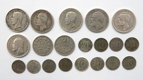 Lot beståenden af 1 kr. sølv 1875, 1889, 1898, 1907, 1913, 1929, 50 øre sølv 1907, 1933, 10 øre sølv 1875, 1876, 1880, 2x 1887, 2x 1892, 1897, 1903, 2x 1909, 1935.