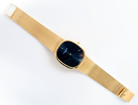 Patek Philippe Genève herrearmbåndsur, ref. nr. 3738/001 i oval urkasse og med lænke af 18 kt. guld. Mørkeblå tonet skive bag safirglas med stregindikation og central sekundviser. Automatisk værk kaliber 240. Urkasse 31 x 36 mm.