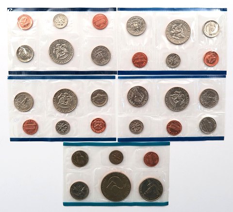 United States Mint, møntsæt 1976 med 1 Cent, , 1 Dime, 5 Cents, Quarter Dollar, Half Dollar og Dollar. Møntsæt 1981, -84, -85 og 1986 med 1 Cent, 1 Dime, 5 Cents, Quarter Dollar og Half Dollar.