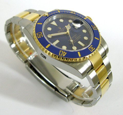 Stort set fabriksnyt Rolex herrearmbåndsur fra juni 2016, model Submariner, referencenummer 116613LB, i kasse og med oysterlænke af guld og stål, midnatsblå farvet skive med stregindeks, central sekundviser, guldlynette indlagt med blåt keramik lynette, datoangivelse ved 3" positionen, safirglas, automatisk urværk. Urkasse 39 mm. i diameter.