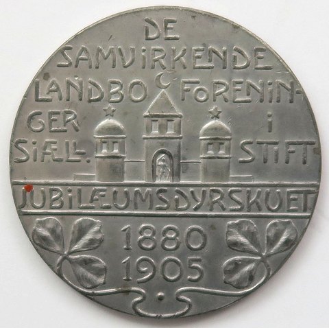Præget til erindring om 2 års jubilæumsdyrskuet 1880-1905. Diameter 45 mm. Originalt P.Hertz Kjøbenhavn opbevaringsæske medfølger.