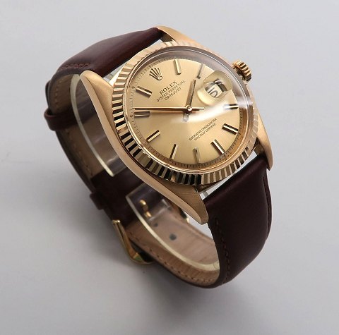 Rolex Oyster Perpetual Datejust herrearmbåndsur, ref nr. 1601 i urkasse af 18 kt guld. Champagnefarvet skive bag safirglas med stregindikation, separat sekundviser og datovisning i #3 position. Automatisk værk. Urkasse diameter 35 mm.